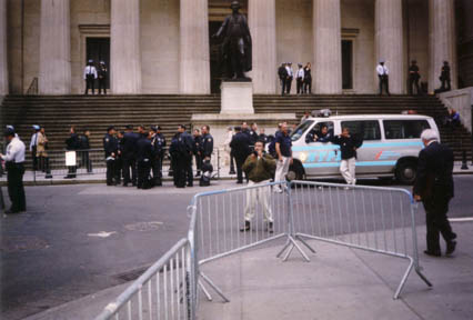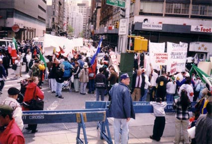 "¡Amnistía!" is composed entirely from recordings made May Day, 2000 at demonstrations for immigrant rights in New York City. Organized by labor unions in the New York Metropolitan area, the day-long protest for amnesty for undocumented immigrant workers began with a rally in Union Square. The over 1000 union members and immigrant-rights supporters marched down Broadway to City Hall. Also on hand were Reclaim the Streets activists who had earlier in the day committed acts of guerilla gardening. The NYPD were also out in force, numbering protesters nearly 10 to 1. Rumors that activists would attempt to shut down Wall Street compelled the NYPD to effectively do the job themselves blocking every entrance to the financial district. In the wake of unregulated globalized capitalÑthe sort of free market dogma espoused by Wall Street interestsÑthe struggle for international labor rights has become a touchstone for worldwide solidarity among third world activists, labor unions and human rights organizations. While economic and political institutions protect the flow of capital across borders, workers compelled to migrate by those same economic forces face brutal persecution, legal harassment and inhumane working conditions. Following the September 2001 World Trade Center and Pentagon attacks, the plight of immigrants nationwide became even more critical. While the Justice Department launched a campaign of intimidation and detention for thousands of immigrants, even the tallying of immigrant deaths at Ground Zero became a matter of controversy. Official death tolls list only one undocumented worker to have died in the Twin Towers disasterÑa twenty-two year old Ecuadoran named Henry Fernandez. However, the numbers are likely higher. The Tepeyac Association, a community organization specifically serving Mexican-Americans living in New York City, has reported at least sixty-six undocumented workers missing as a result of the WTC collapse. Meanwhile, across the nation, the political momentum surrounding immigrant amnesty experienced an about face. Instead of expanding the rights of immigrants, the US far-right political regime has sought greater powers to detain, deport, imprison and suppress the civil liberties of immigrants. Along with intensification of border militarization, the US government has made it more difficult for immigrants to join labor unions whereby US workers can secure health insurance, collective bargaining, living wages and back-pay for wages lost during a strike. And yet, despite a period of retreat, by the end of 2002 organizations like the National AFL-CIO had announced plans to renew the amnesty campaign. For the 6 million undocumented immigrant workers in the United States, the issue of amnesty remains a priority regardless the political resolve of those in power.