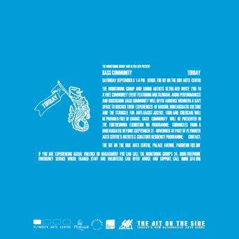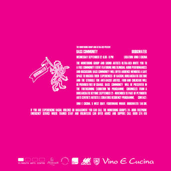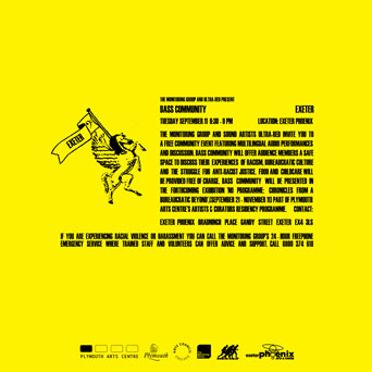 This the fall of 2007, Ultra-red toured the southwest of England presenting a series of performances in cooperation with The Monitoring Group. Guided by protocols for facilitation, the "Bass Community" performances asked audiences in four rural towns to enter into an analysis of the conditions of racism in the southwest. These towns included Torbay, Plymouth, Exeter, and Bridgwater. Prior to the event, Elliot Perkins from Ultra-red and The Rural Racism Project (an initiative of the anti-racist organisation, The Monitoring Group) invited audience members to prepare a brief recording of a sound they considered to signify racism in the region. These sounds included recordings of conversations, the sounds of a workplace, or even audio evidence from a brutal racist attack. As audiences in each town worked through the relationships between sounds and terms, Ultra-red members introduce musical elements into the conversation, referencing a dub aesthetic that called to mind the anti-racist traditions of dub music and poetry. Occupying small art centres and, in the case of Bridgwater, restaurants, Bass Community built on the work initiated at the Encuentro Plymouth in organizing an analysis of racism and anti-racist struggle in the context of a recomposition of migration in the UK.
