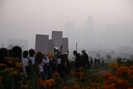 projectdescription After two minutes, the ensemble paused in their walking to listen to statements, or arias, from one of five soloists. Ultra-red invited five community organizers whose organizations earlier in the year had participated in a workshop organized by the Community HIV/AIDS Mobilization Project. These organizations work on issues such as HIV support for prisoners, human rights for prisoners, prison abolition and autonomous community development. After each aria, the next chorus member moved into position to lead the procession further down the path with another two-minute performance for voice and gesture. For Ultra-red, the experiment contributed to our on-going development toward an AIDS activist opera, or operaction. Ultra-red would like to thank Bill Kelley, Jr. for negotiating the use of the park and to the curators of "Tránsito(ry) Público" for including the action in their program of public events. Finally, we would like to thank the members of the ensemble, with special thanks to the soloists who performed the arias: Pedro Soto, Claudia Gomez, Edward Cervantes, Austin Delgadillo, and Cathy Olufs. (Organized by Dont Rhine and Robert Sember.)