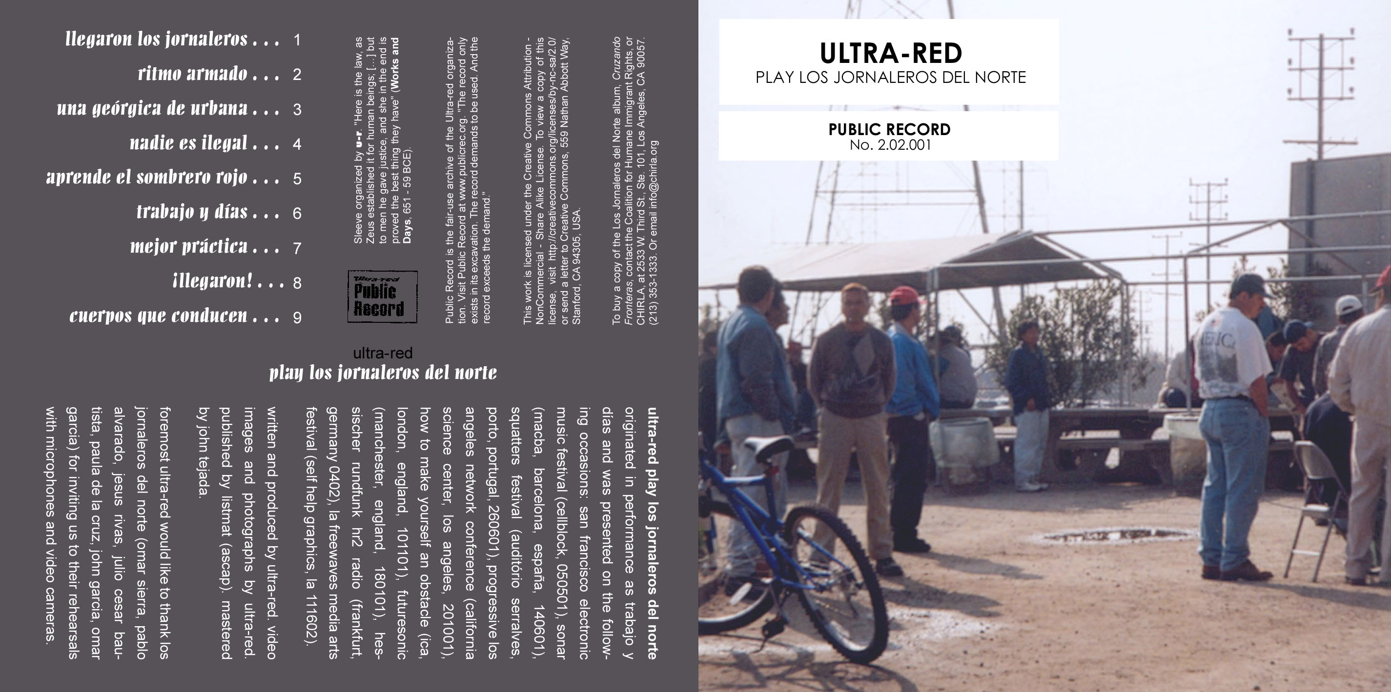 DSP desperados Ultra-red face-off with LA's Los Jornaleros. From the rehearsals of the Ranchero posse to the street corners of day laborers, the album takes in the sound and poetry of migrant struggle in Los Angeles. "Play Los Jornaleros del Norte" features a mix of minimalismo and Ultra-red's interpretation of electronic norteña.