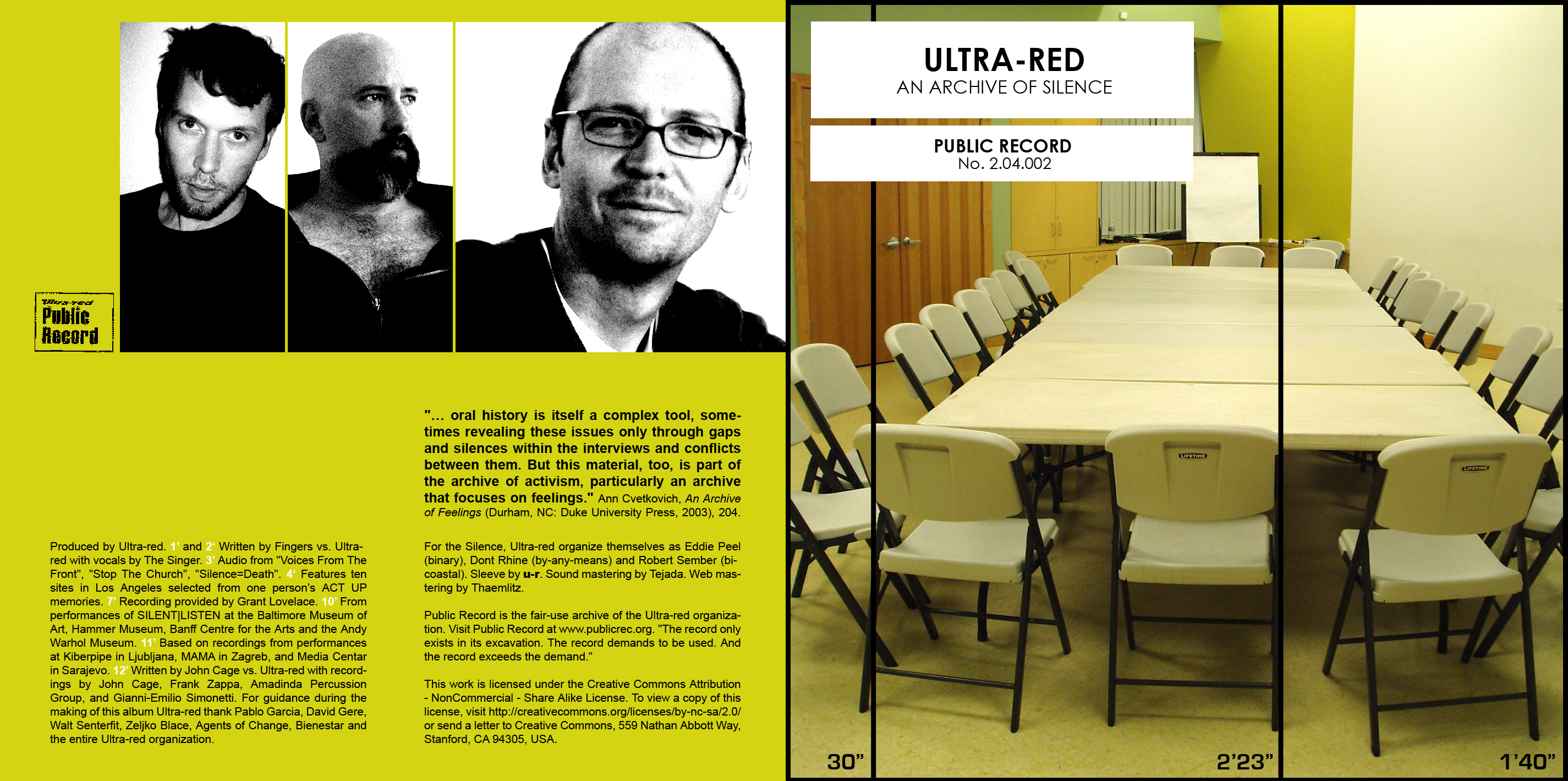 Since 1994, Ultra-red has deployed recorded sound in the space of political reflection, analysis and action. What action is possible when no record exists? What politics arise from a record purloined, plagiarized or presented by proxy? Reflecting on their AIDS activism, Ultra-red present an archive of site recordings, bootleg remixes and silences.